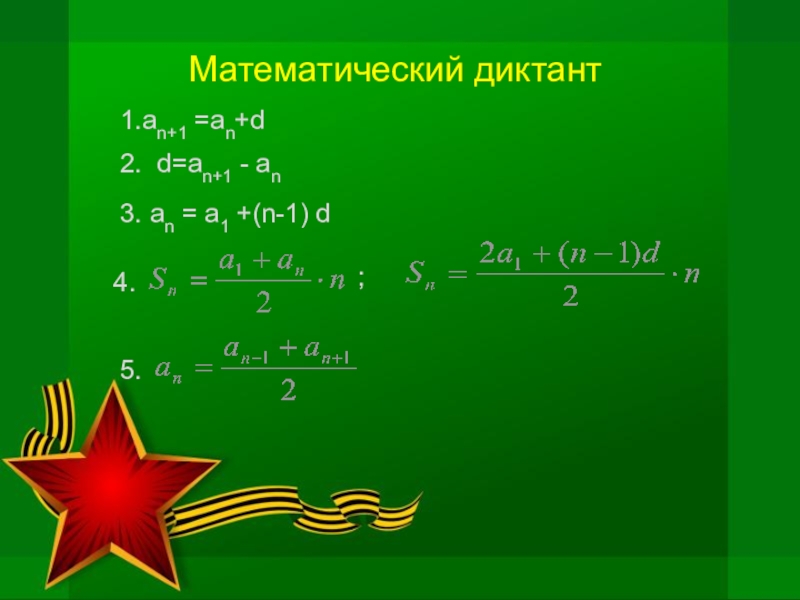 Математический диктант2. d=an+1 - an 3. an = a1 +(n-1) d4.;5.1.an+1 =an+d
