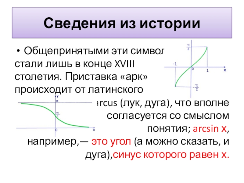 Сведения из историиСовременные обозначения arcsin и arctg появляются в 1772г.в работах венского математика Щерфера и  известного