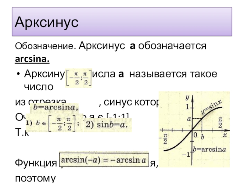 Арксинус Обозначение. Арксинус а обозначается arcsina.Арксинусом числа а называется такое число из отрезка