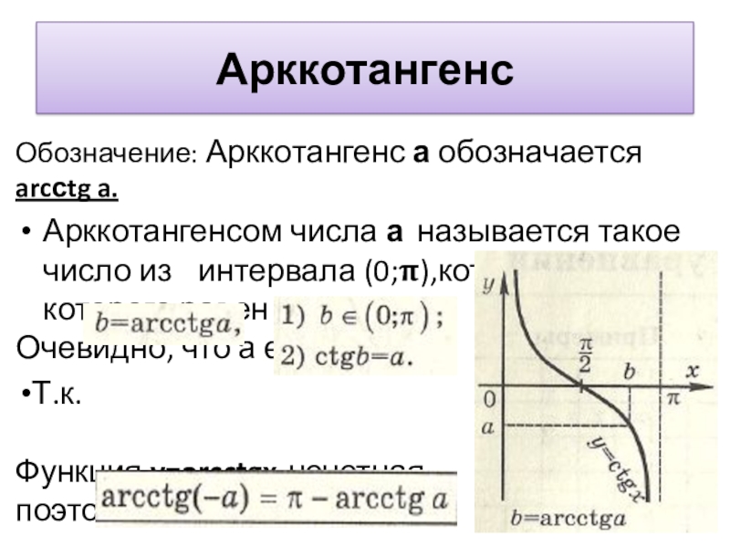АрккотангенсОбозначение: Арккотангенс а обозначается arcсtg a.Арккотангенсом числа а	называется такое число из	интервала (0;?),котангенс которого равен а.Очевидно, что а