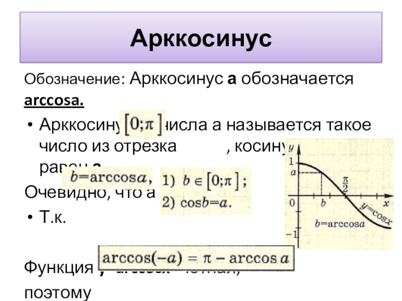 АрккосинусОбозначение: Арккосинус а обозначается arccosa.Арккосинусом числа а называется такое число из отрезка