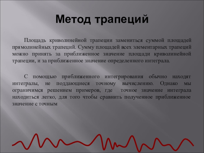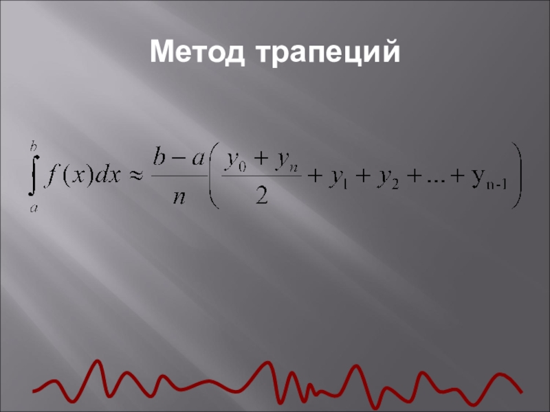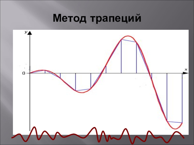 Метод трапецийПлощадь криволинейной трапеции замениться суммой площадей прямолинейных трапеций. Сумму площадей всех элементарных трапеций можно принять за