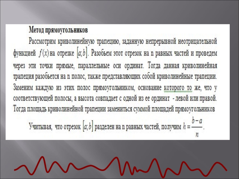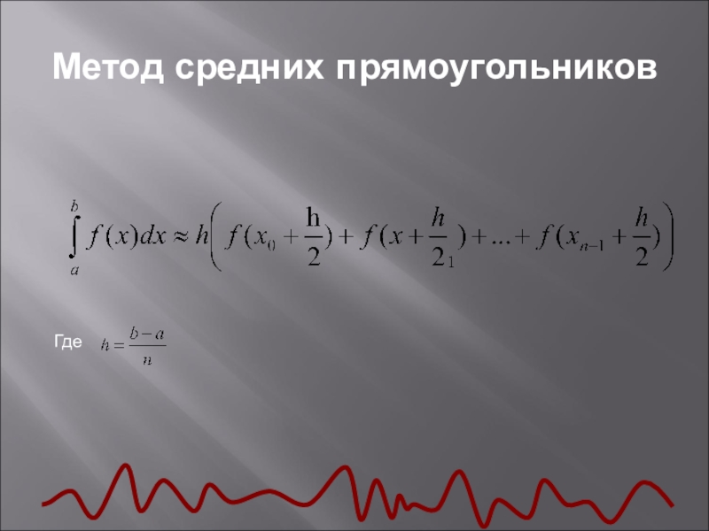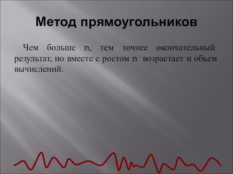 Метод прямоугольниковЧем больше n, тем точнее окончательный результат, но вместе с ростом n возрастает и объем вычислений.