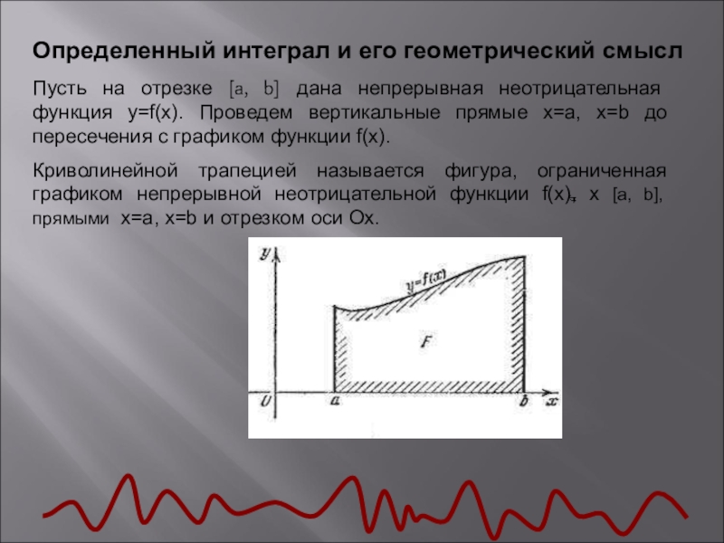 Определенный интеграл и его геометрический смыслПусть на отрезке [a, b] дана непрерывная неотрицательная функция y=f(x). Проведем вертикальные