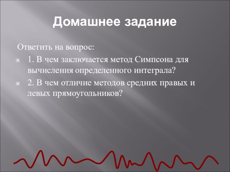 Домашнее заданиеОтветить на вопрос: 1. В чем заключается метод Симпсона для вычисления определенного интеграла?2. В чем отличие