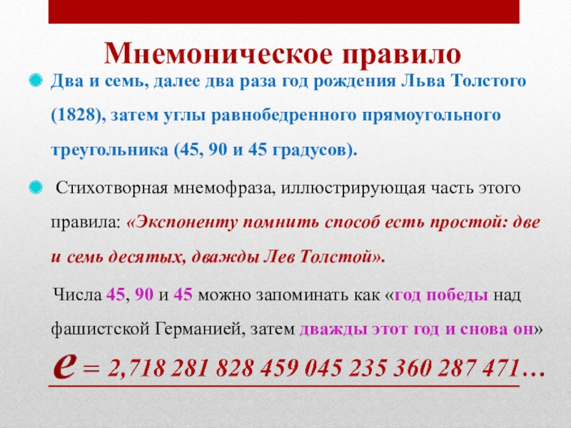 Стихотворная мнемофраза, иллюстрирующая часть этого правила: «Экспоненту помнить способ есть простой: две и семь десятых, дважды Лев Толстой».
