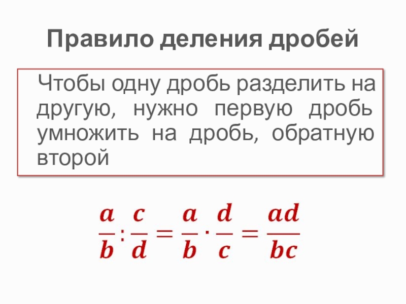 Правило деления дробей  Чтобы одну дробь разделить на другую, нужно первую дробь умножить на дробь, обратную