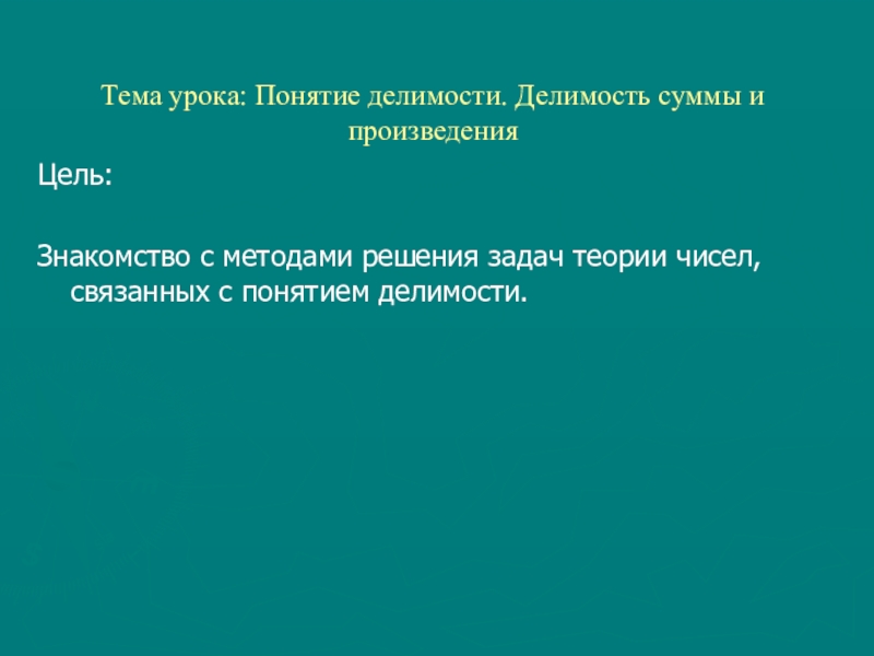 Тема урока: Понятие делимости. Делимость суммы и произведенияЦель:Знакомство с методами решения задач теории чисел, связанных с понятием