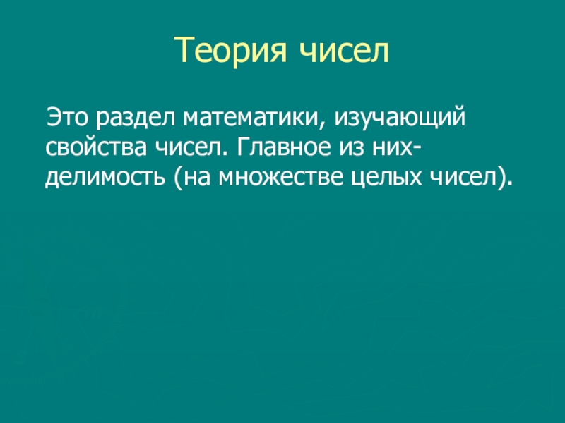 Теория чисел  Это раздел математики, изучающий свойства чисел. Главное из них- делимость (на множестве целых чисел).