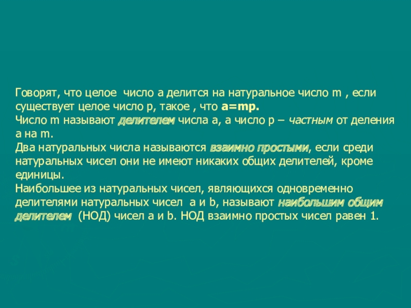 если существует целое число p, такое , что a=mp. Число m называют делителем числа a, а число p – частным от деления a на m. Два натуральных числа называются взаимно простыми, если среди натуральных чисел они не имеют никаких общих делителей, кроме единицы. Наибольшее из натуральных чисел, являющихся одновременно делителями натуральных чисел a и b, называют наибольшим общим делителем (НОД) чисел a и b. НОД взаимно простых чисел равен 1.
