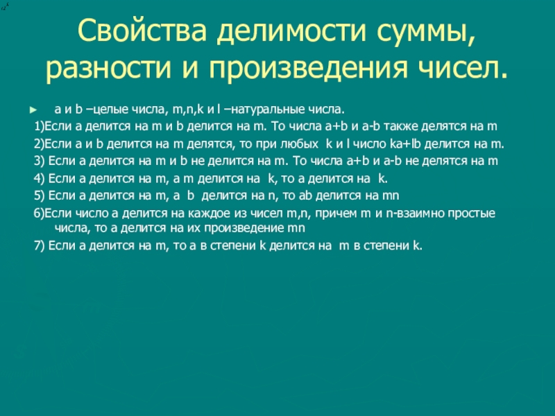 Слайд 6Свойства делимости суммы, разности и произведения чисел.