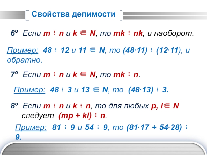 6о Если m ⋮ n и k N, то mk ⋮ nk, и наоборот.