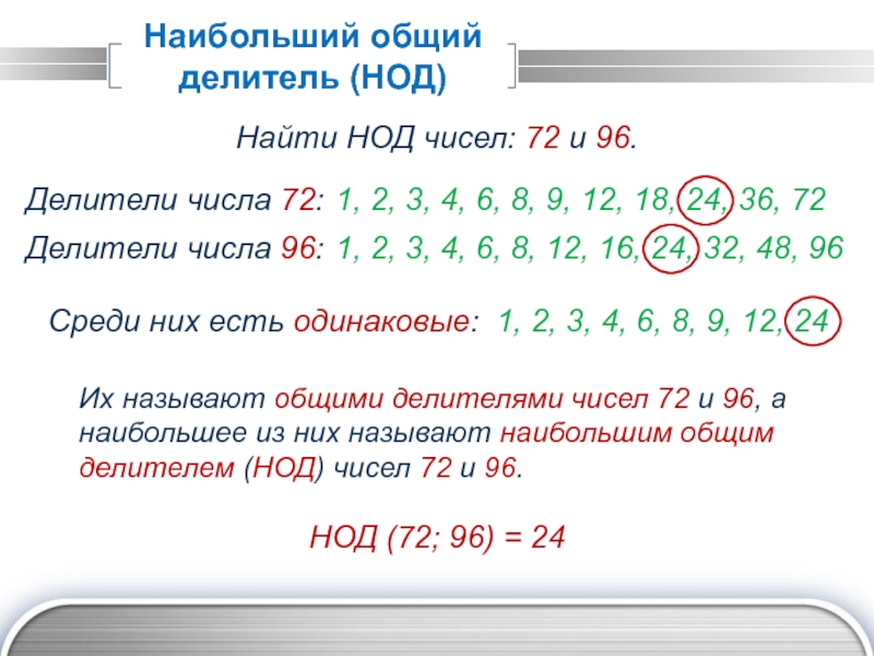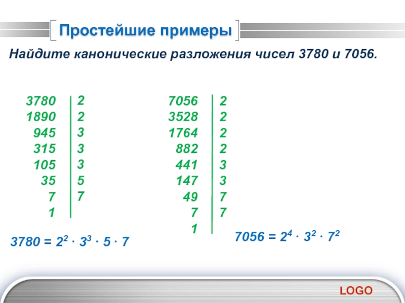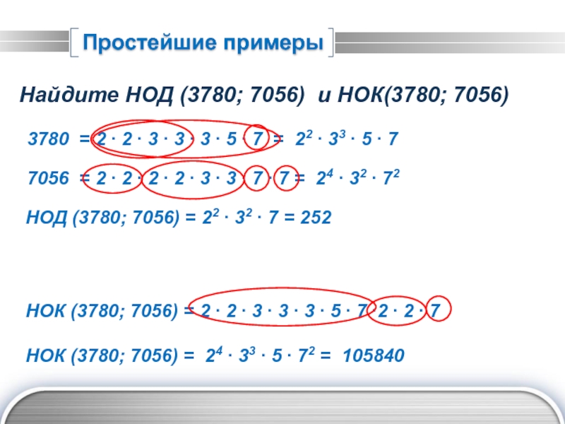 НОД (3780; 7056) = 22 ∙ 32 ∙ 7 = 252
