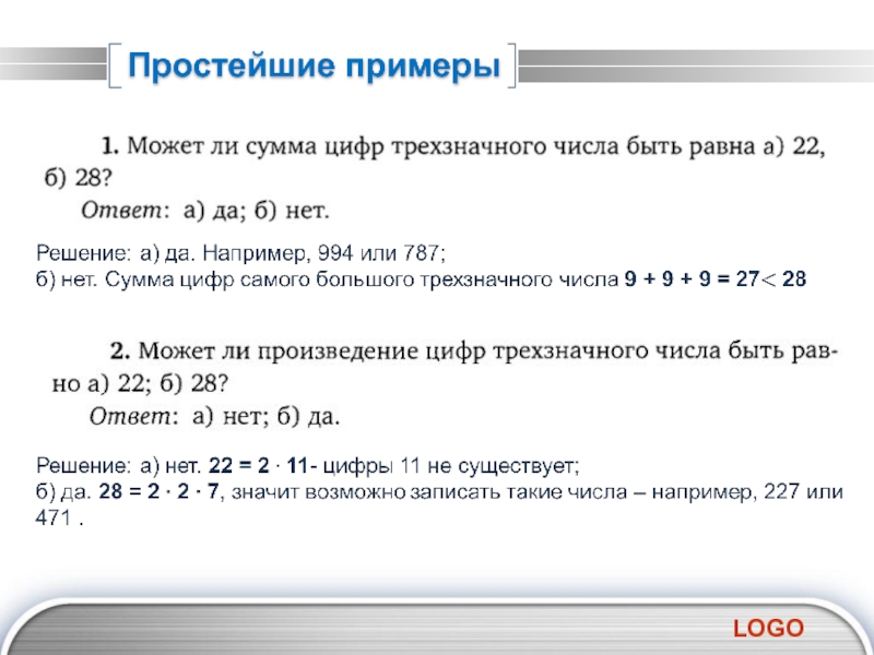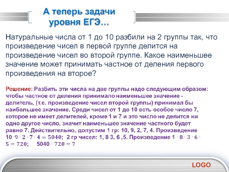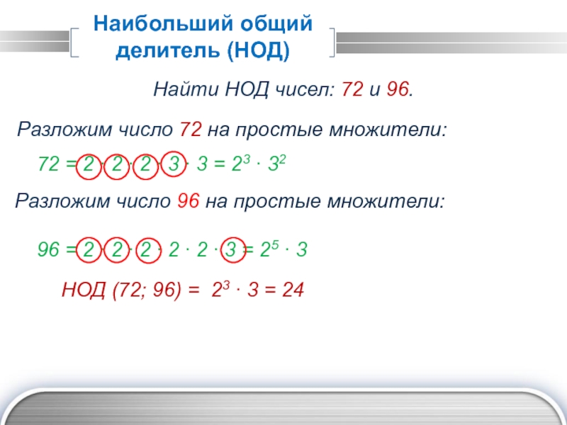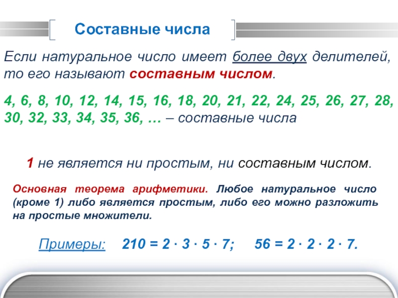 Примеры: 210 = 2 ∙ 3 ∙ 5 ∙ 7; 56 = 2 ∙ 2 ∙ 2 ∙ 7.