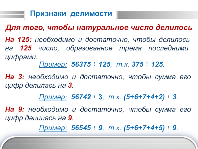 Пример: 56375 ⋮ 125, т.к. 375 ⋮ 125.