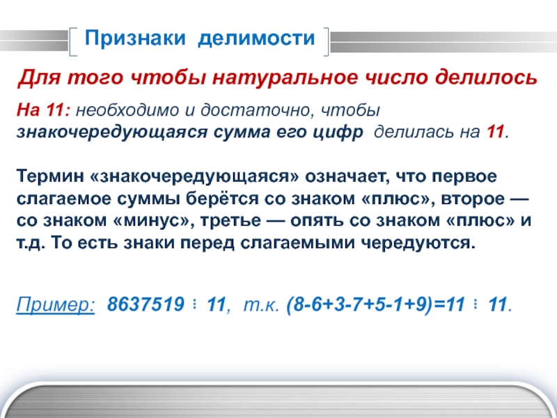Пример: 8637519 ⋮ 11, т.к. (8-6+3-7+5-1+9)=11 ⋮ 11.