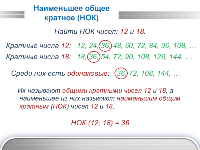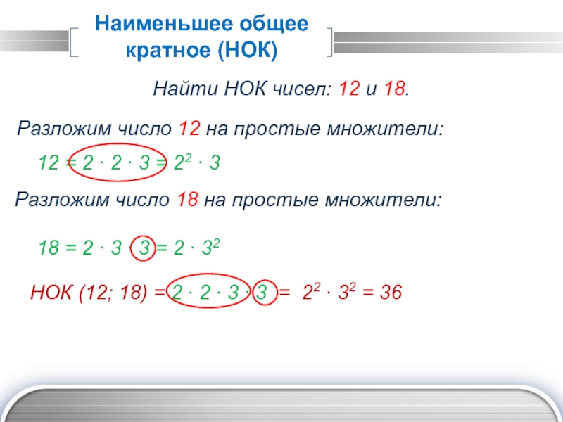 НОК (12; 18) = 2 ∙ 2 ∙ 3 ∙ 3 = 22 ∙ 32 = 36