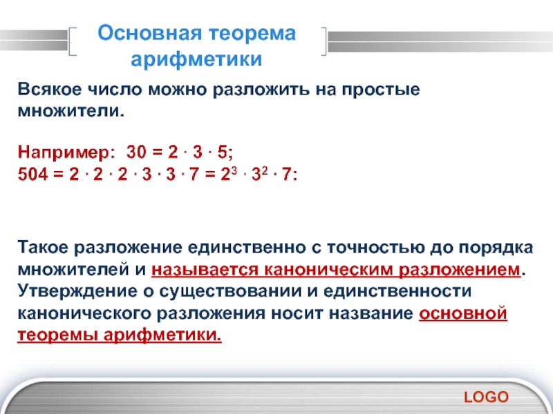 Основная теорема арифметики. Любое натуральное число (кроме 1) либо является простым, либо его можно разложить на простые множители.