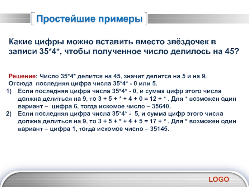 Решение: Число 35*4* делится на 45, значит делится на 5 и на 9.