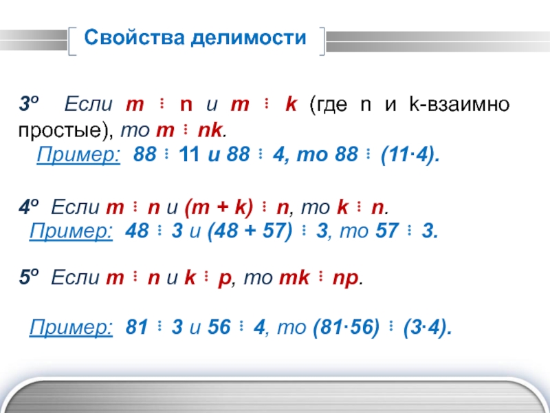 5о Если m ⋮ n и k ⋮ p, то mk ⋮ np.