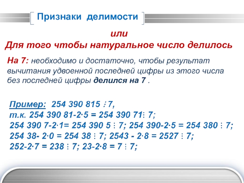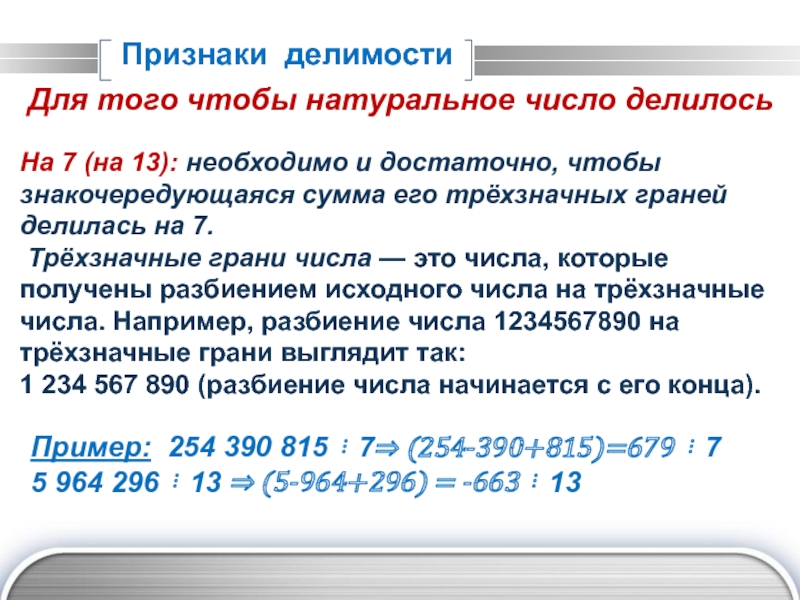 Пример: 254 390 815 ⋮ 7⇒ (254-390+815)=679 ⋮ 7
