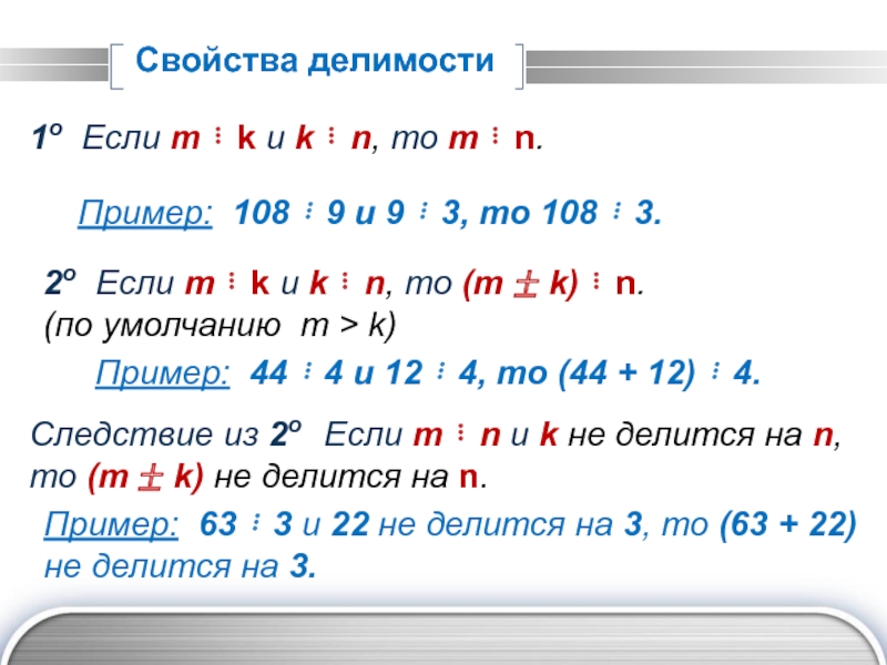 2о Если m ⋮ k и k ⋮ n, то (m ± k) ⋮ n.