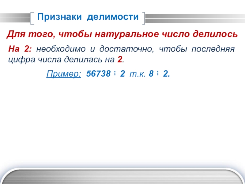Пример: 56738 ⋮ 2 т.к. 8 ⋮ 2.
