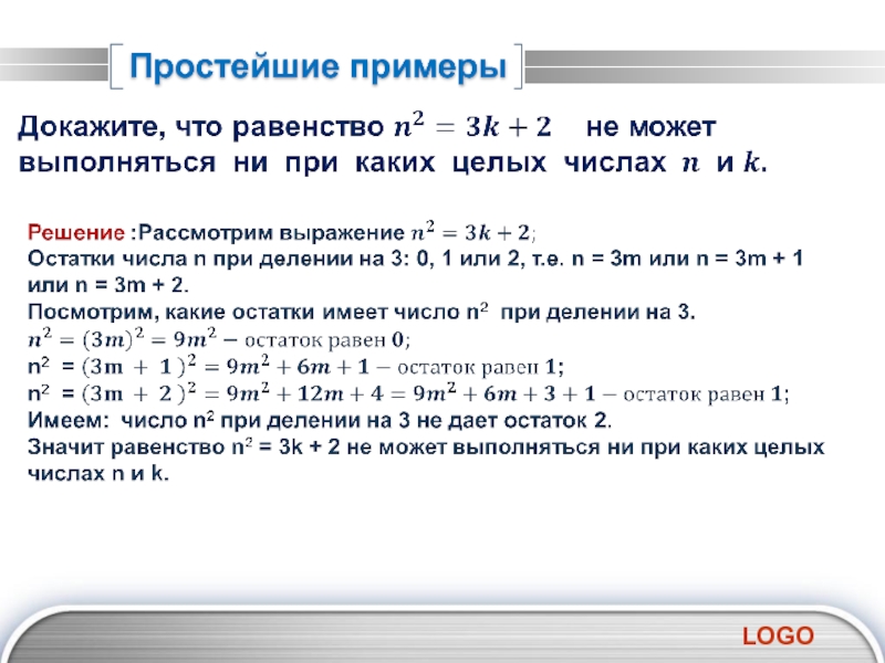 Следствие из 2о Если m ⋮ n и k не делится на n, то (m ± k) не делится на n.