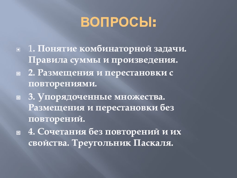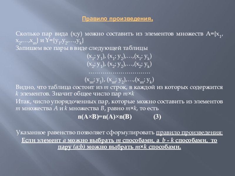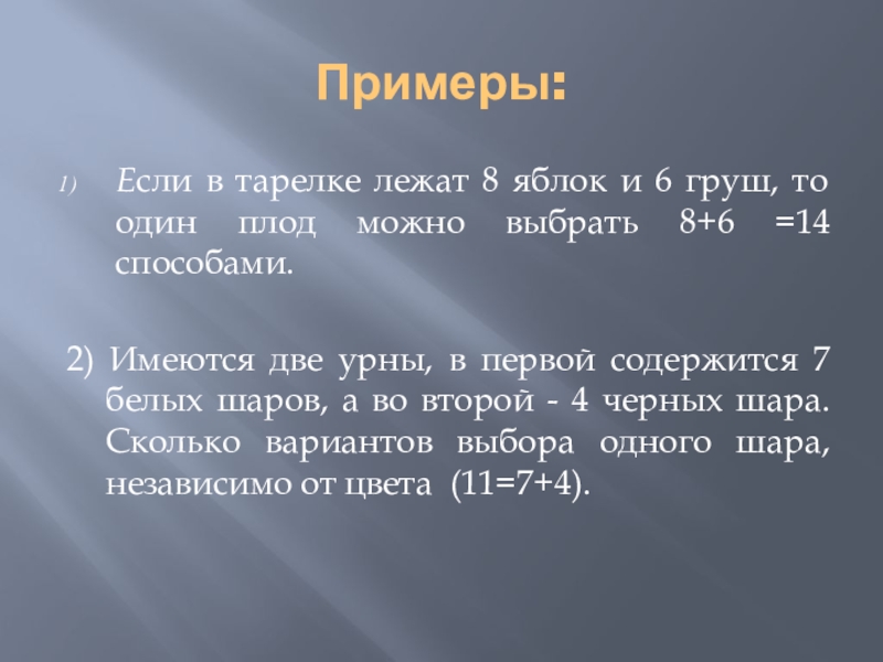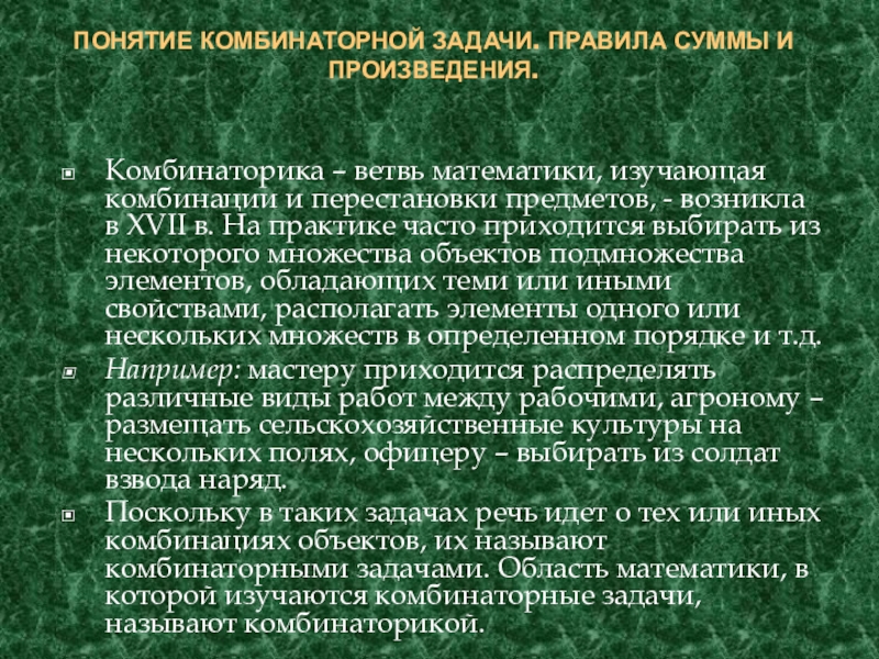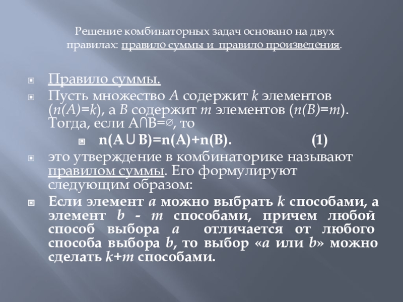 Решение комбинаторных задач основано на двух правилах: правило суммы и правило произведения.