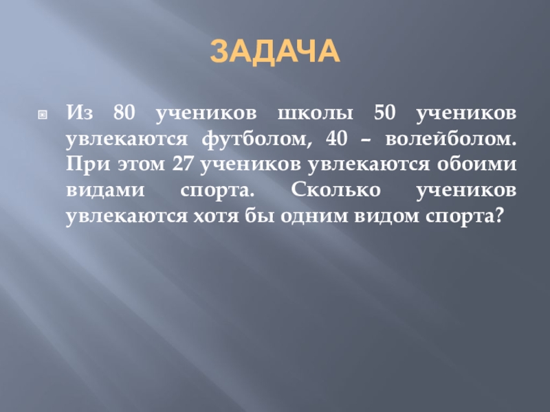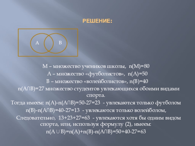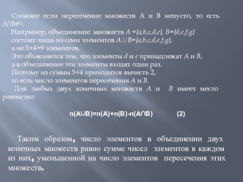 Таким образом, число элементов в объединении двух конечных множеств равно сумме чисел элементов в каждом из них, уменьшенной на число элементов пересечения этих множеств.