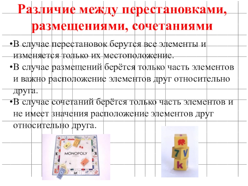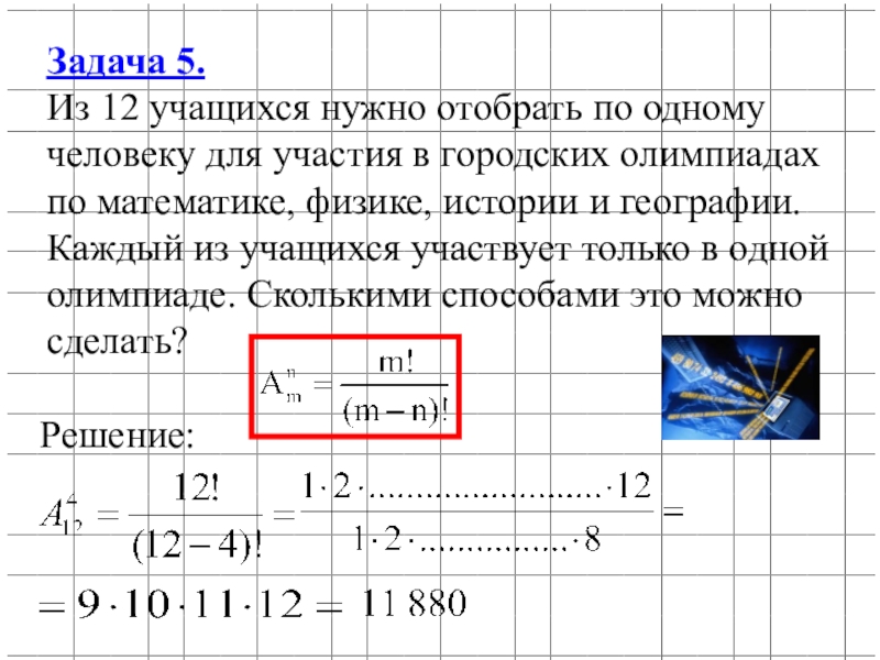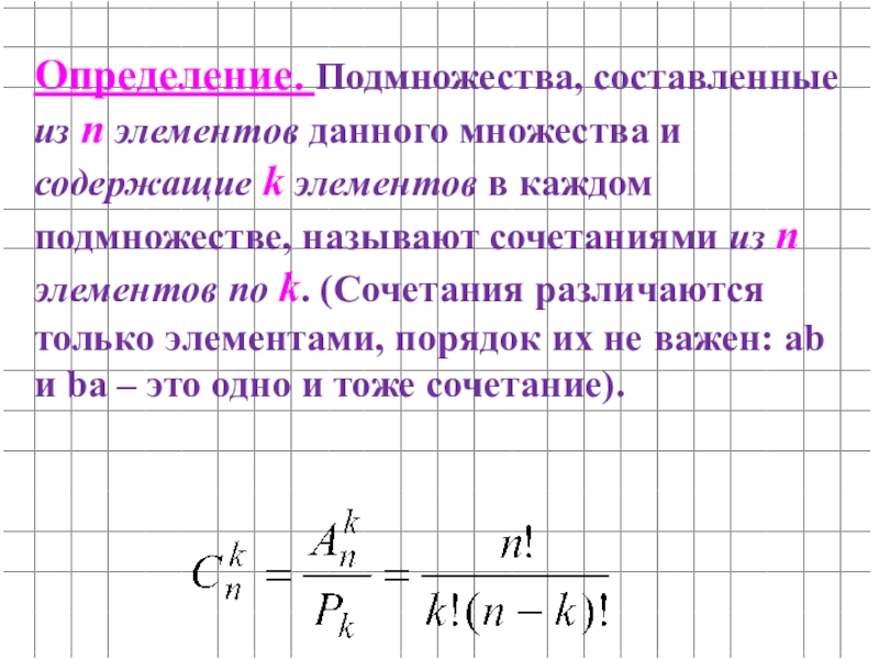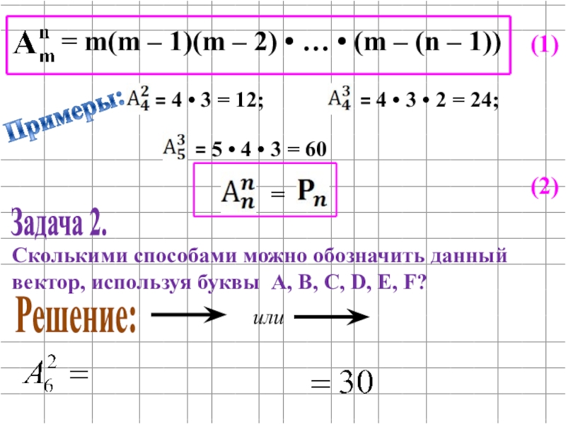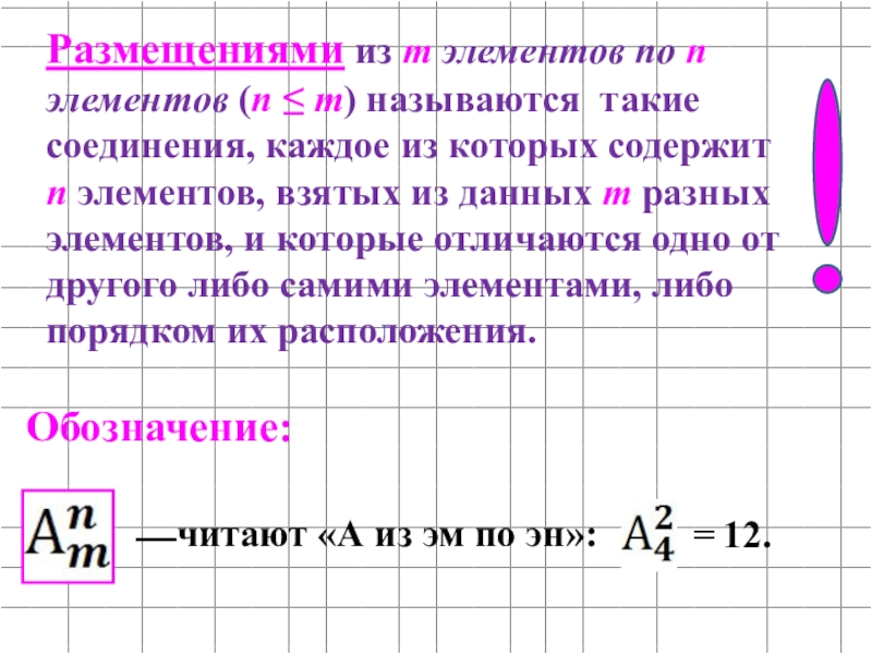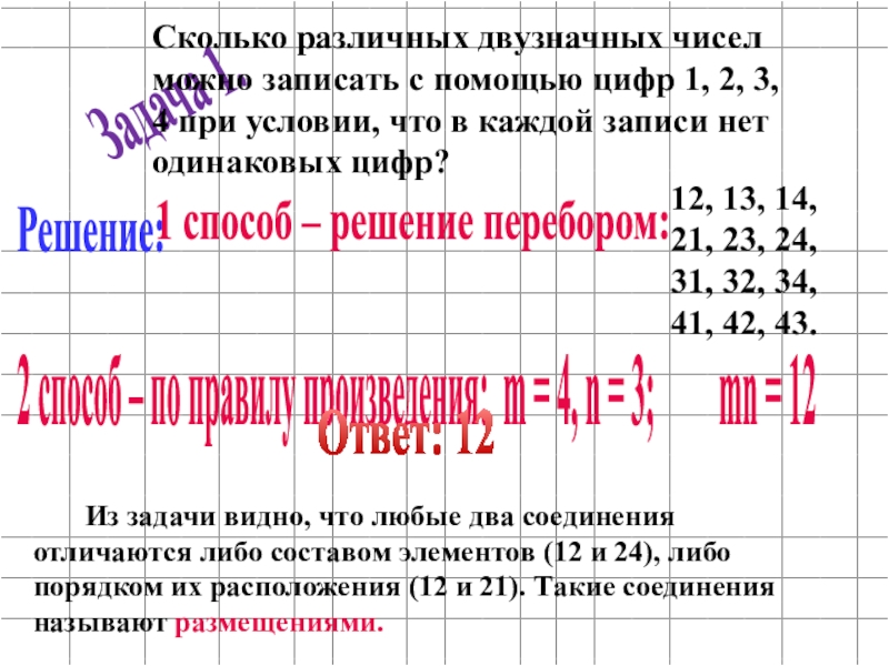 Из задачи видно, что любые два соединения отличаются либо составом элементов (12 и 24), либо порядком их расположения (12 и 21). Такие соединения называют размещениями.