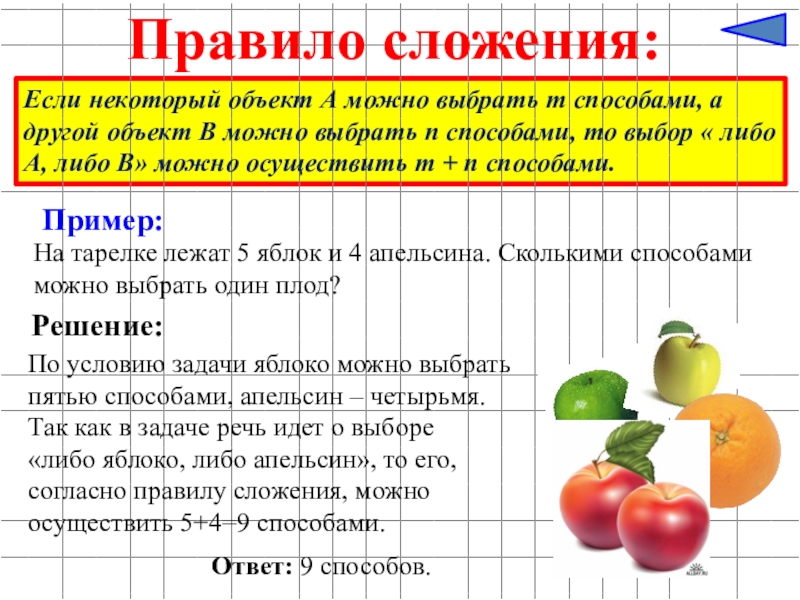 На тарелке лежат 5 яблок и 4 апельсина. Сколькими способами можно выбрать один плод?