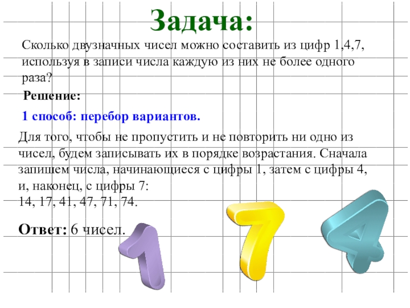 Для того, чтобы не пропустить и не повторить ни одно из чисел, будем записывать их в порядке возрастания. Сначала запишем числа, начинающиеся с цифры 1, затем с цифры 4, и, наконец, с цифры 7: