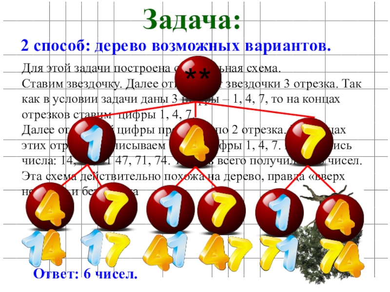 Эту задачу можно решить по-другому и намного быстрее, не строя дерева возможных вариантов. Рассуждать будем так. Первую цифру двузначного числа можно выбрать тремя способами. Так как после выбора первой цифры останутся две, то вторую цифру можно выбрать из оставшихся цифр уже двумя способами. Следовательно, общее число искомых трехзначных чисел равно произведению 3∙2, т.е. 6.