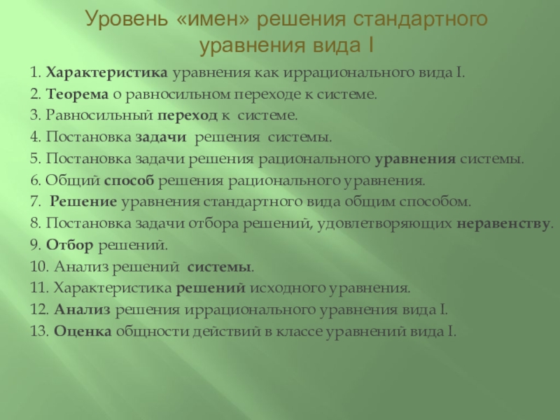 12. О. Для всякого иррационального уравнения стандартного вида I указанные этапы исследования являются общими.