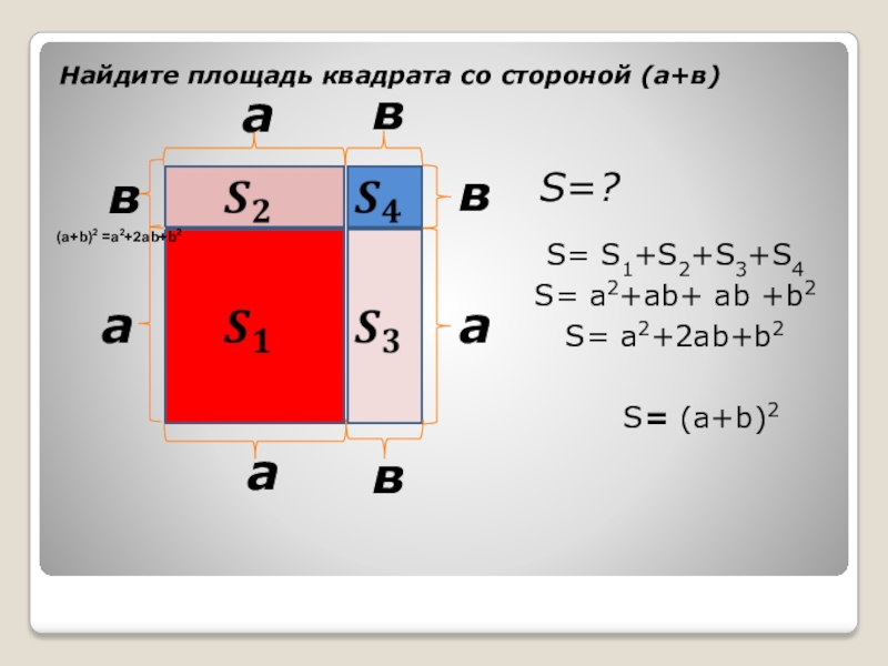 Найдите площадь квадрата со стороной (а+в)S=?ааавввав(а+b)2 =а2+2аb+b2