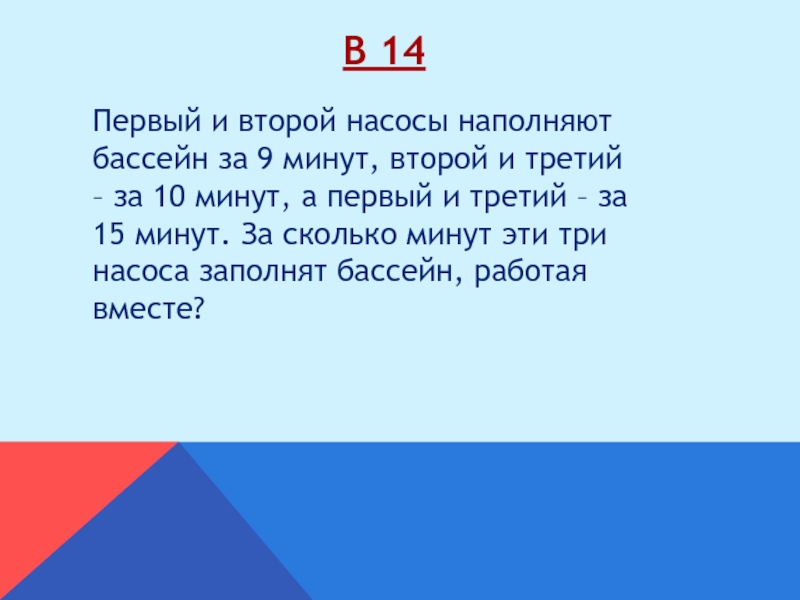 В 14Первый и второй насосы наполняют бассейн за 9 минут, второй и третий – за 10 минут,