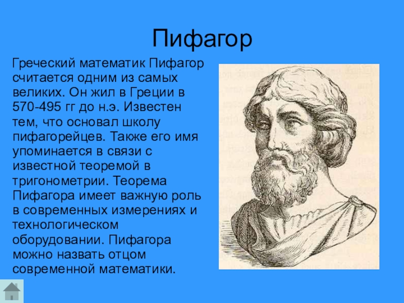 жил в Греции в 570-495 гг до н.э. Известен тем, что основал школу пифагорейцев. Также его имя упоминается в связи с известной теоремой в тригонометрии. Теорема Пифагора имеет важную роль в современных измерениях и технологическом оборудовании. Пифагора можно назвать отцом современной математики.