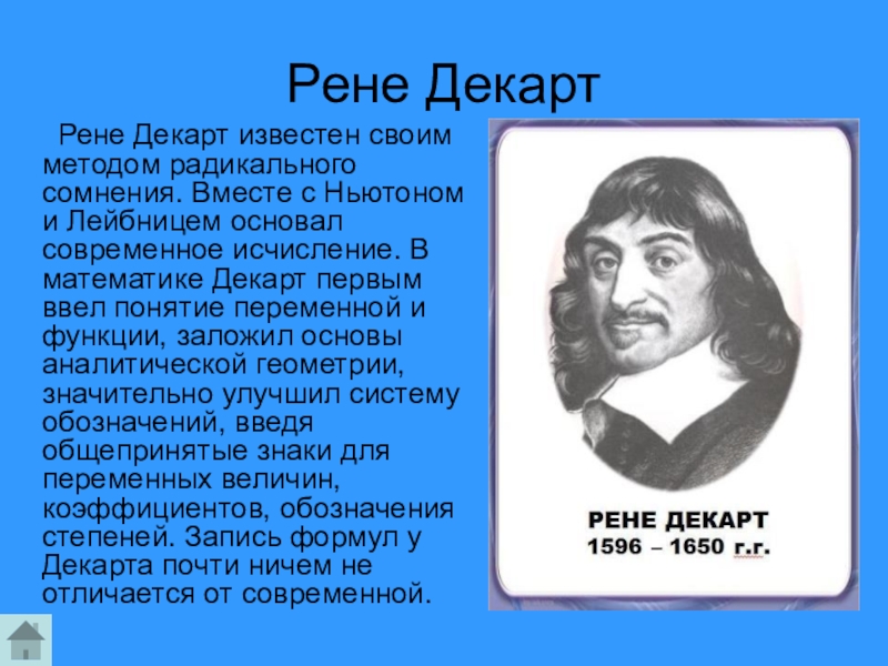 Рене Декарт   Рене Декарт известен своим методом радикального сомнения. Вместе с Ньютоном и Лейбницем основал