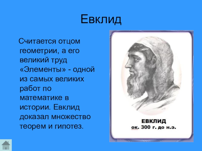 Евклид  Считается отцом геометрии, а его великий труд «Элементы» - одной из самых великих работ по