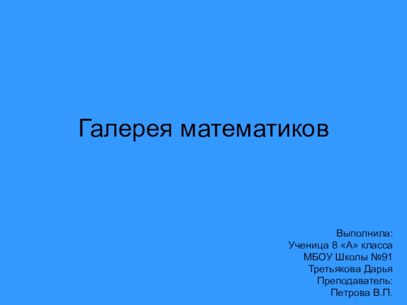 Галерея математиковВыполнила:Ученица 8 «А» классаМБОУ Школы №91Третьякова ДарьяПреподаватель:Петрова В.П.