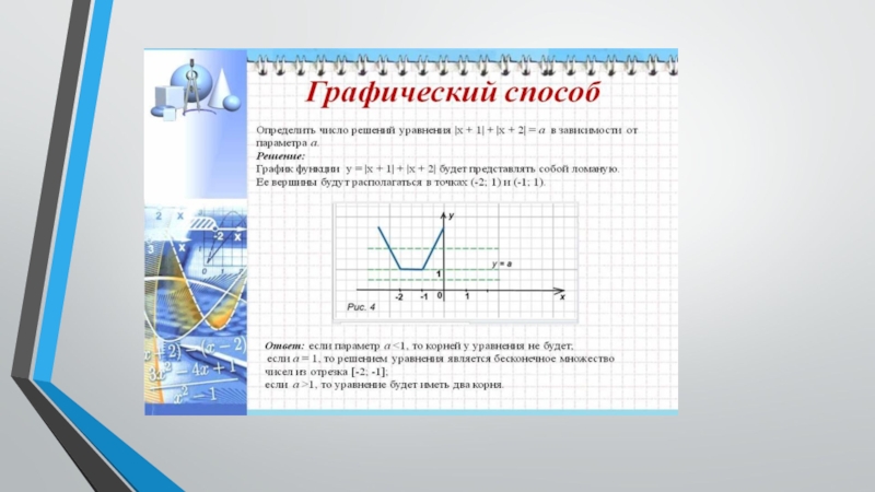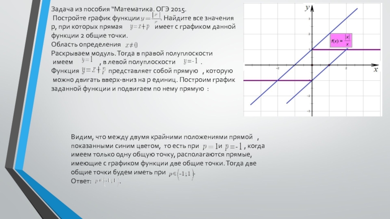 Видим, что между двумя крайними положениями прямой , показанными синим цветом, то есть при и , когда имеем только одну общую точку, располагаются прямые, имеющие с графиком функции две общие точки. Тогда две общие точки будем иметь при .