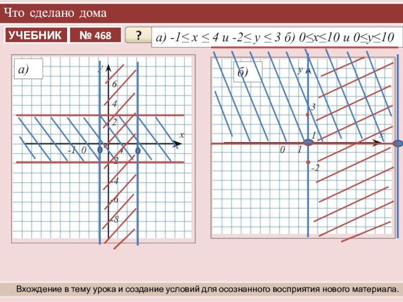 а) -1≤ х ≤ 4 и -2≤ у ≤ 3 б) 0≤х≤10 и 0≤у≤10