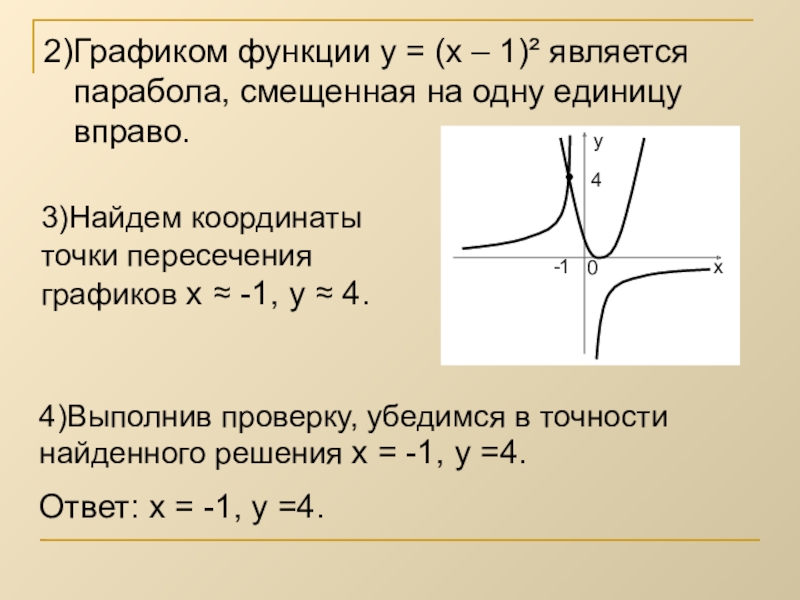 3)Найдем координаты точки пересечения графиков х ≈ -1, у ≈ 4.