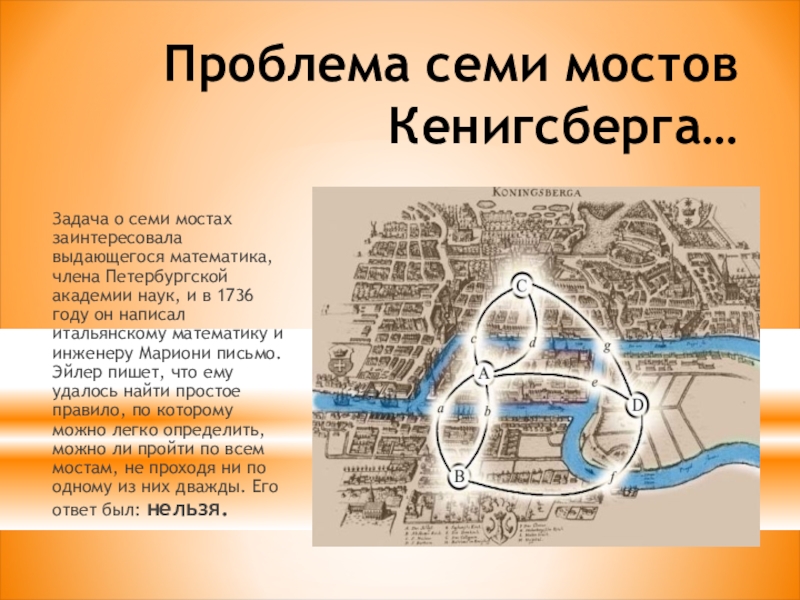 1. Число нечетных вершин (вершин, к которым ведет нечетное число линий) должно быть четно, иначе граф не может существовать.