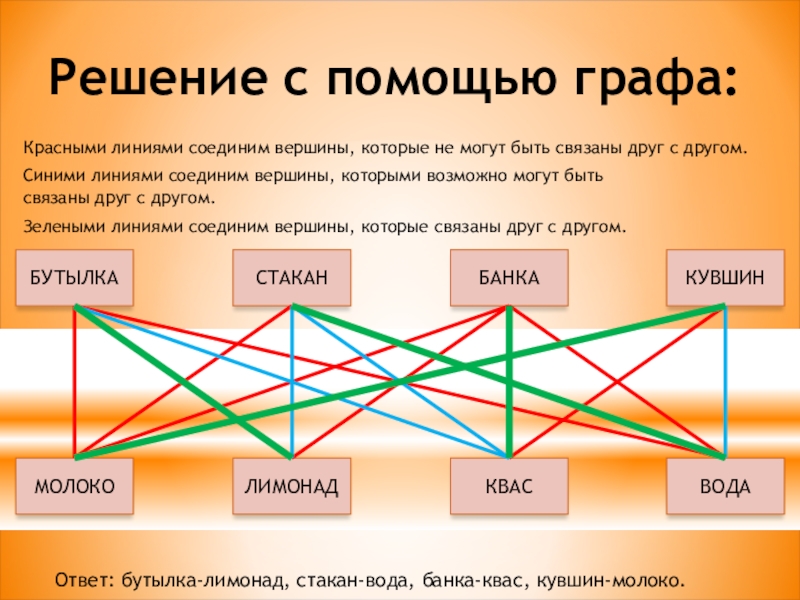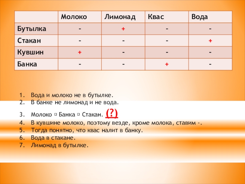 Ответ: бутылка-лимонад, стакан-вода, банка-квас, кувшин-молоко.