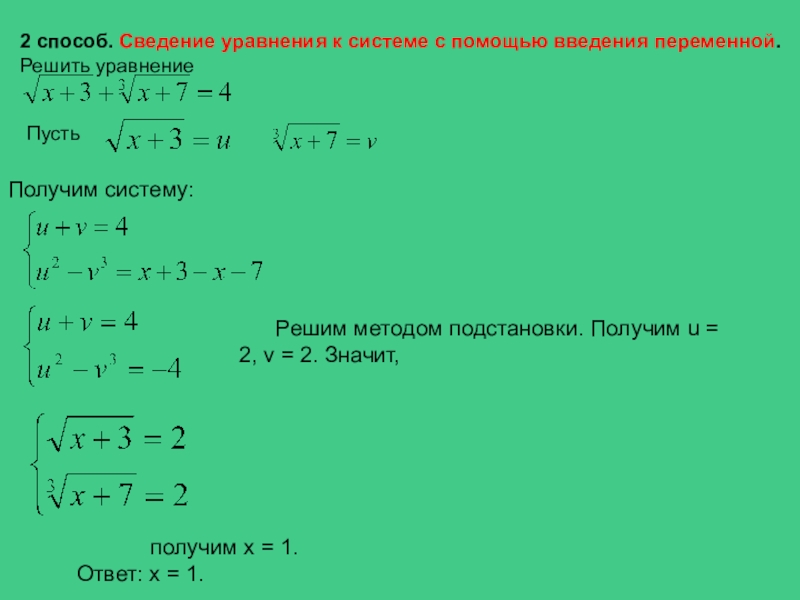 Решим методом подстановки. Получим u = 2, v = 2. Значит,