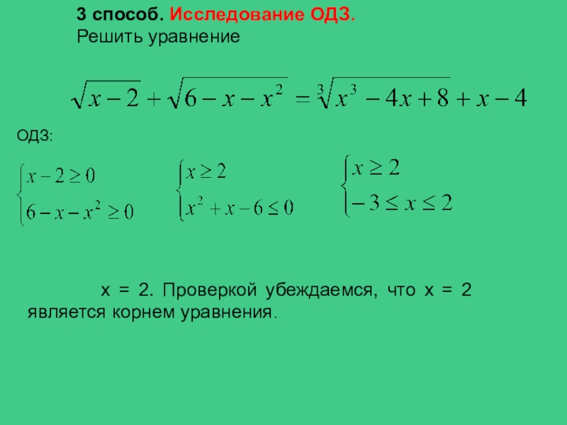 х = 2. Проверкой убеждаемся, что х = 2 является корнем уравнения.