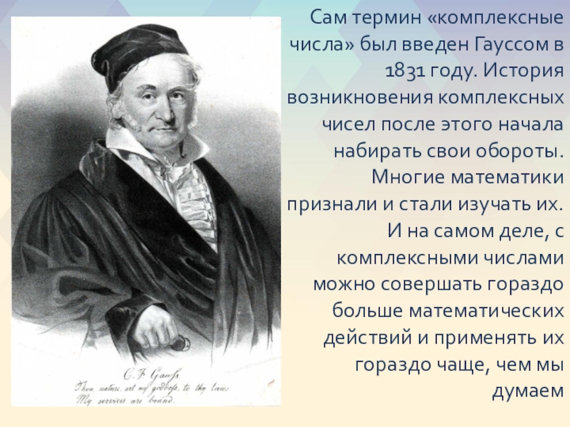 Слайд 5Сам термин «комплексные числа» был введен Гауссом в 1831 году. История возникновения