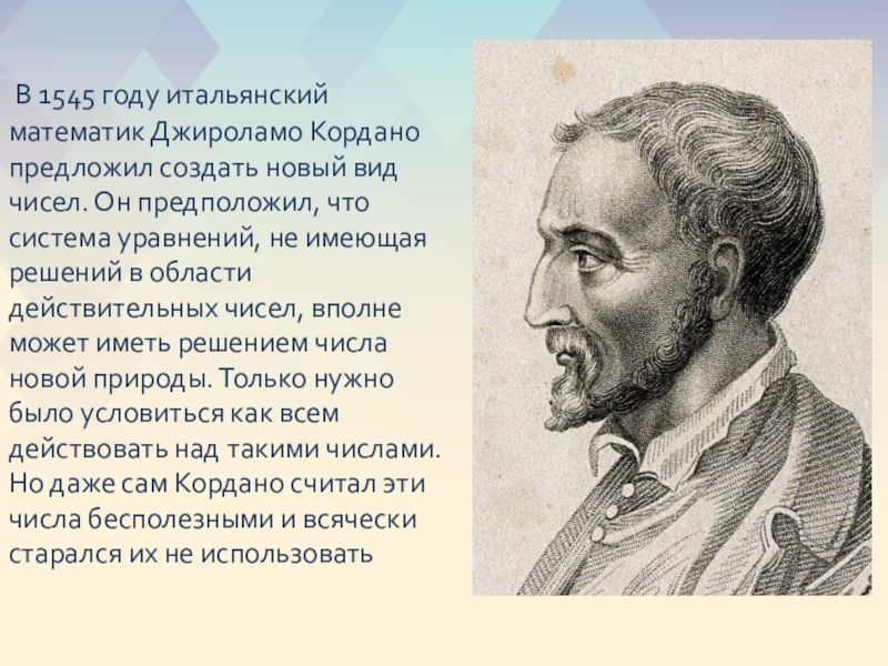 Слайд 3 В 1545 году итальянский математик Джироламо Кордано предложил создать новый вид